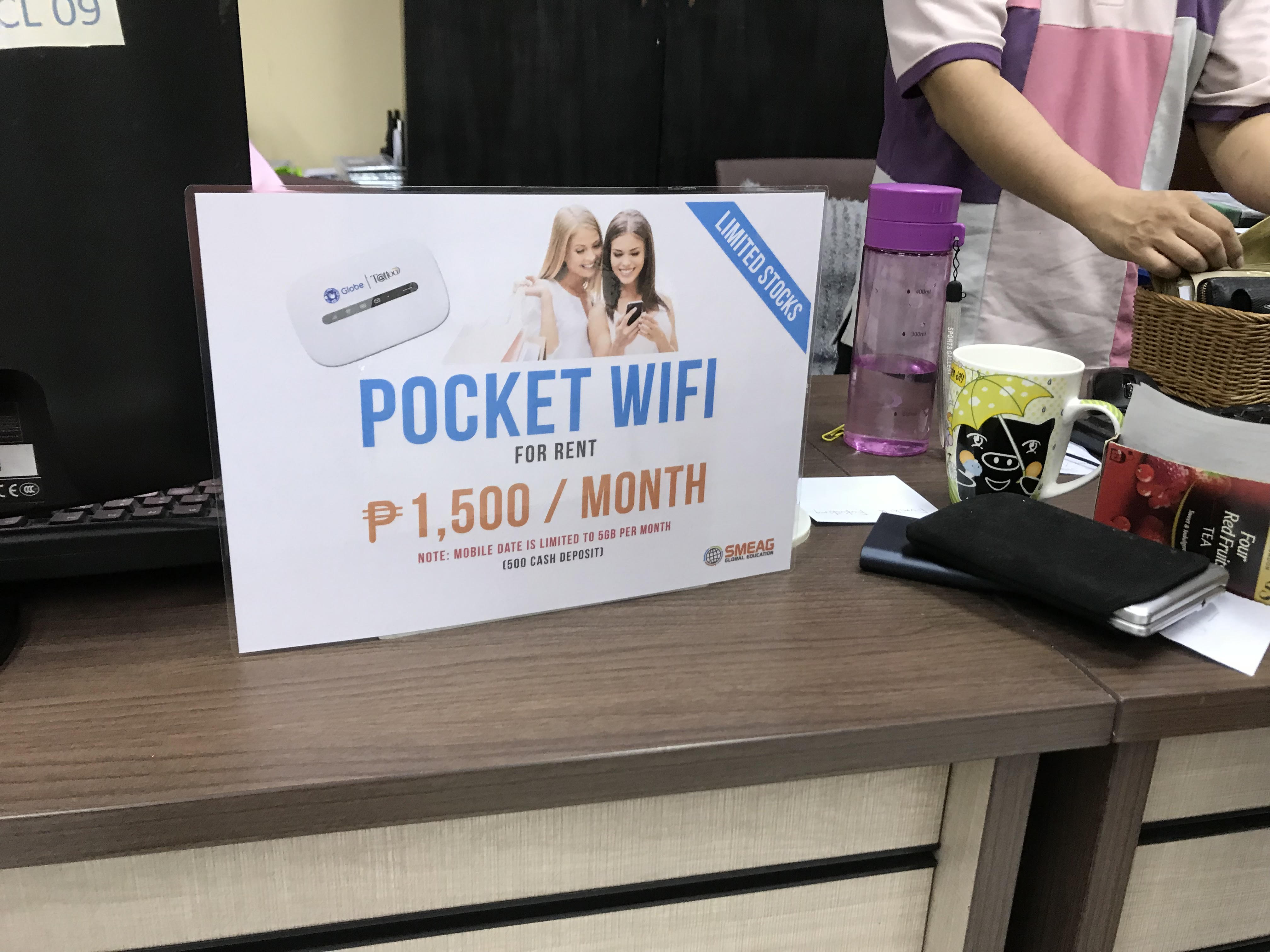 SMEAG校のスパルタ、クラシック、キャピタルの各キャンパスでは共有フロアを中心に無料のwi-fiが24時間ご利用頂けます。とはいえ日本とは違い、一歩外に出ればwi-fiを利用できる場所は多くありません。でも日本のポケットwifiは高い!という方に朗報です。SMEAGの各キャンパスでもポケットwi-fiをレンタルできます。1か月単位のレンタルで、料金は1,500ペソです(約4,000円)。但し台数には限りがありますので、ご注意ください。レンタルの申込みは各キャンパスのオフィスで承ります。